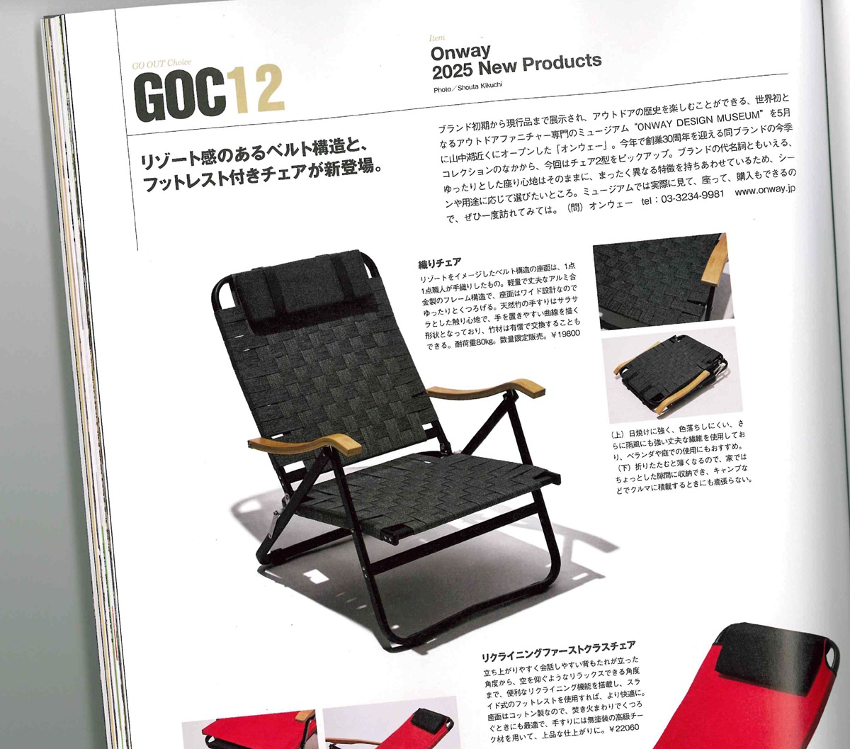 11月30日発売のGOOUT 1月号に、オンウェーの織りチェアと新商品のリクライニングファーストクラスチェアを掲載して頂きました!