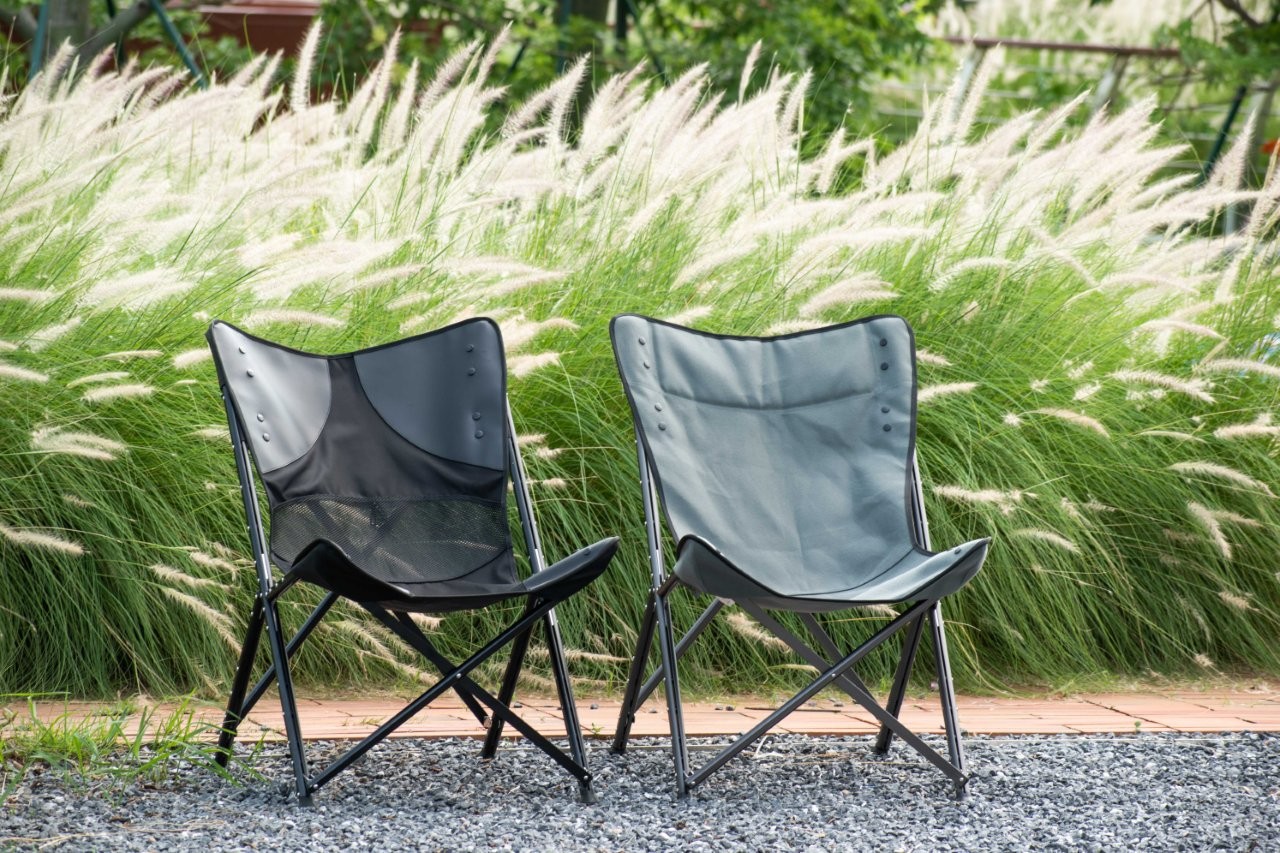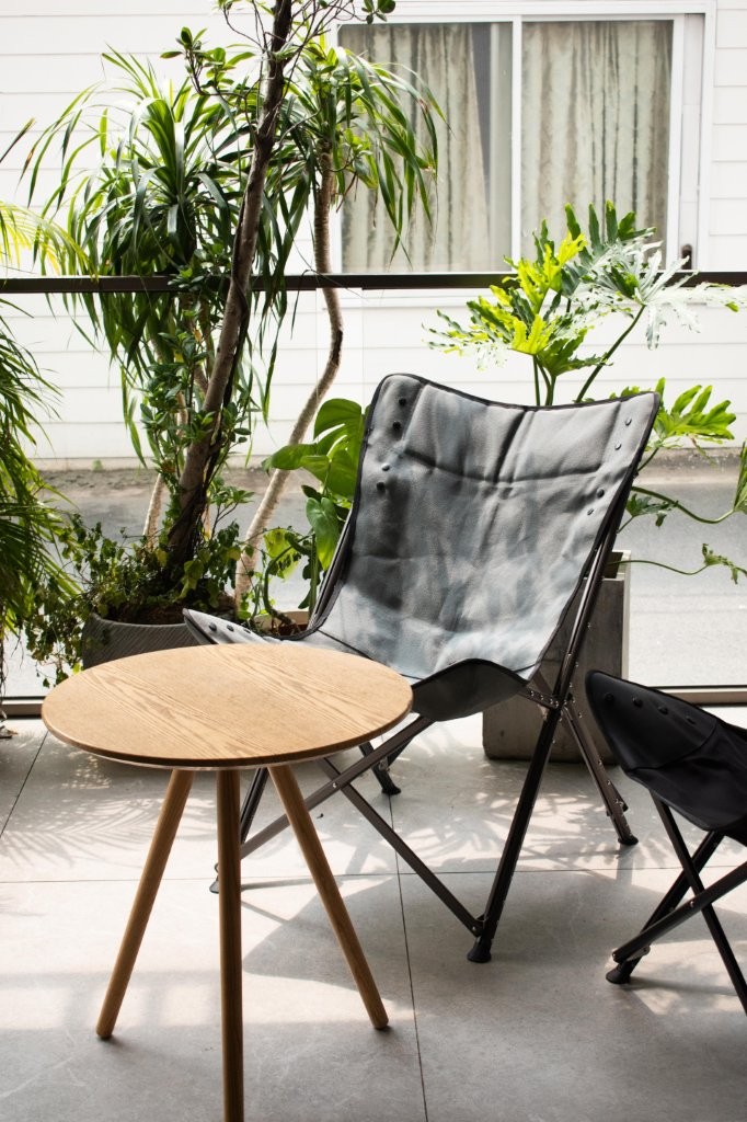半円形のパイプを合わせて接続金具をサンドイッチした構造。座面を取り外せば細く収納可能。フレームのリベットはタフな見た目に加え、フレームが開かないように固定する役割があり、丈夫な構造になっています。
